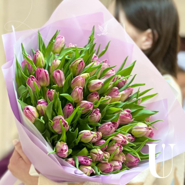 Нежный букет из роз, гвоздик и других цветов в дизайнерской упаковке