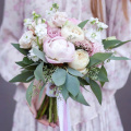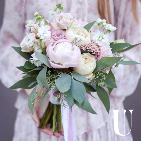 Нежный букет из роз, гвоздик и других цветов в дизайнерской упаковке