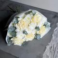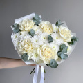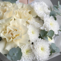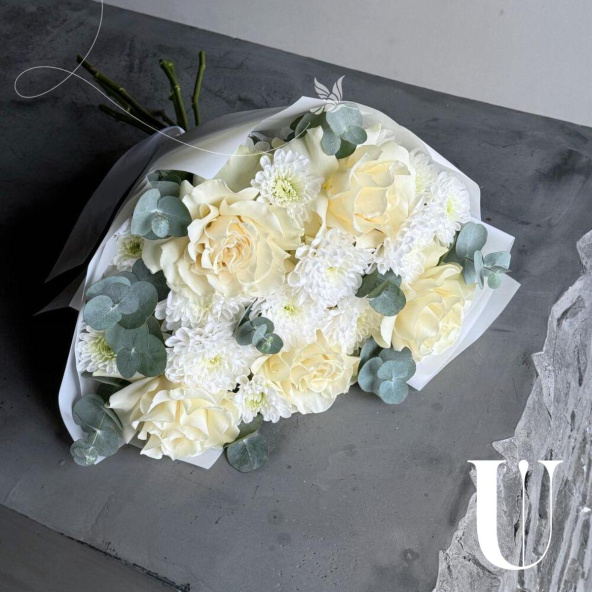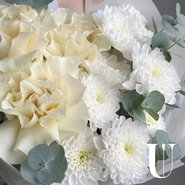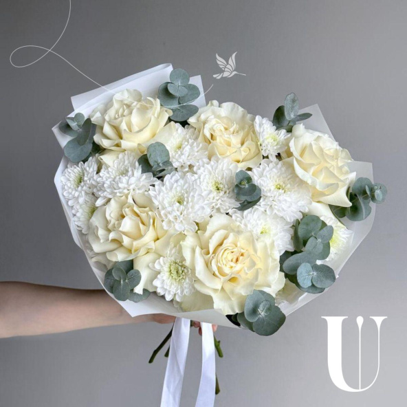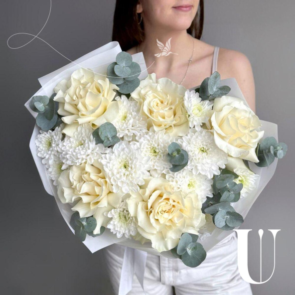 Нежный букет в белой цветовой гамме из французских роз, кустовой хризантемы и эвкалипта.