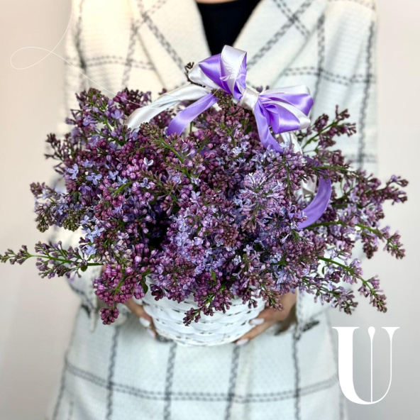Композиция в белых тонах из эустом, кустовых хризантем Баккарди и белых маттиол в корзине