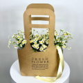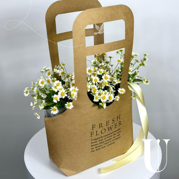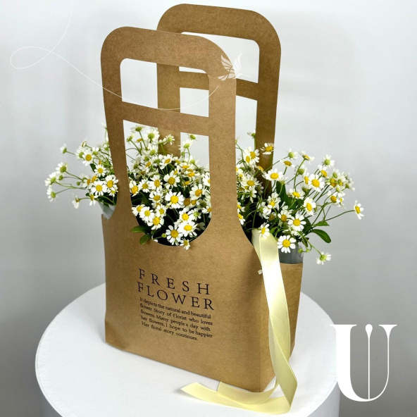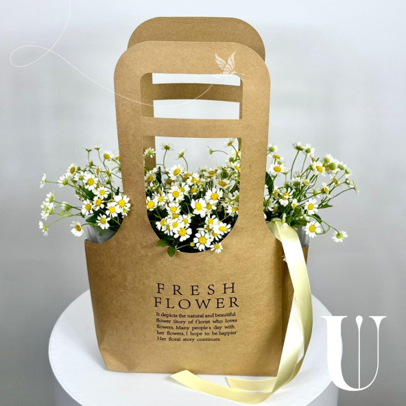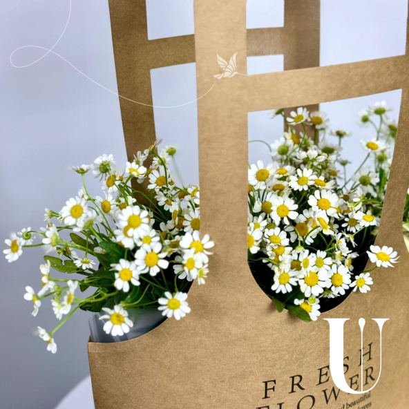 Композиция из белых кустовых хризантем в крафтовой сумке