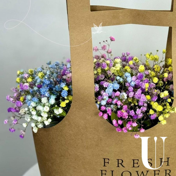Композиция из розовой гипсофилы в крафтовой сумке