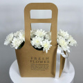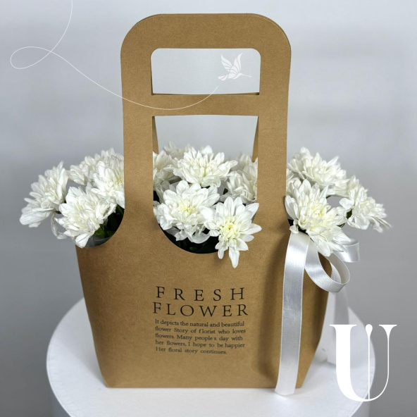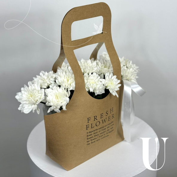 Композиция из белых кустовых хризантем в крафтовой сумке
