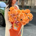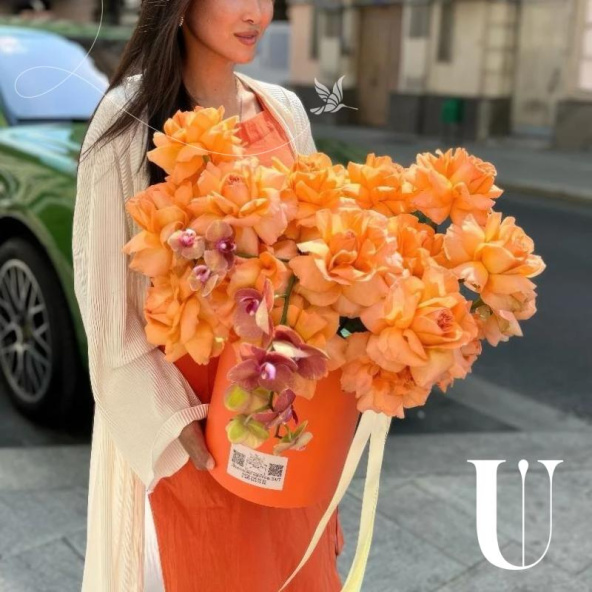 Композиция из 25 оранжевых роз в розовой шляпной коробке