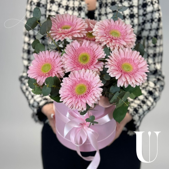5 розовых гербер в розовой шляпной коробке