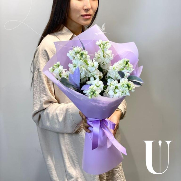 Стильный букет из тюльпанов микс и грин белл в фиолетовой упаковке