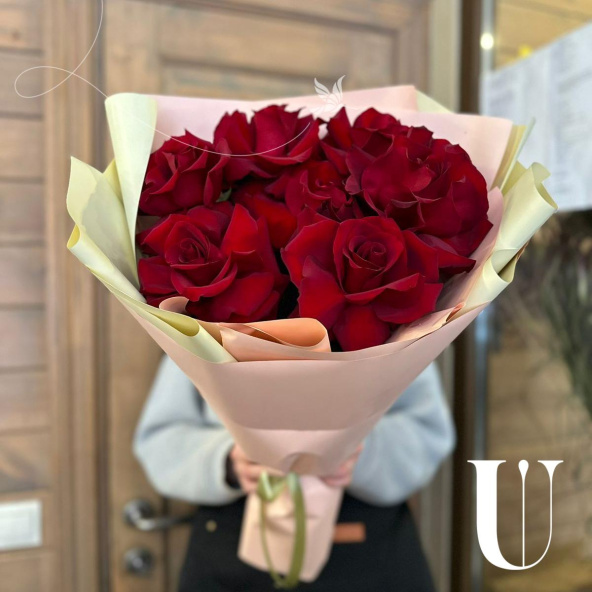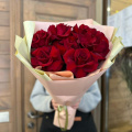 Монобукет из 3 красных вывернутых роз в белой упаковке