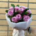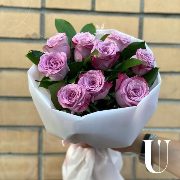 Монобукет из белых роз и роз сорта Леди Раффаэла в сиреневой упаковке