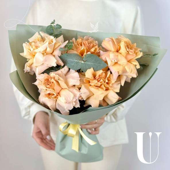 Стильный букет из белых роз в зеленой упаковке