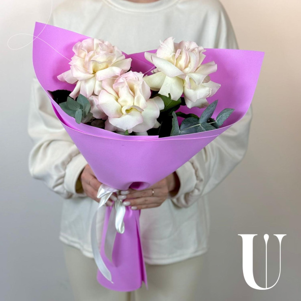 Монобукет из 3 красных вывернутых роз в белой упаковке