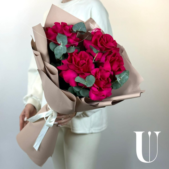 Стильный букет из красных роз в белой дизайнерской упаковке