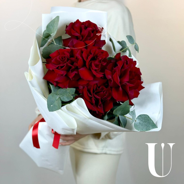 Монобукет из 5 красных роз в дизайнерской упаковке