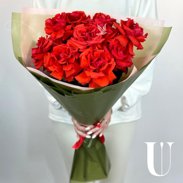 Букет из красных роз, роз Валентина и розового лагуруса в дизайнерской упаковке