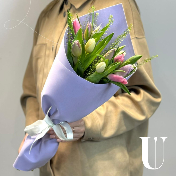 Монобукет из белых роз и роз сорта Леди Раффаэла в сиреневой упаковке