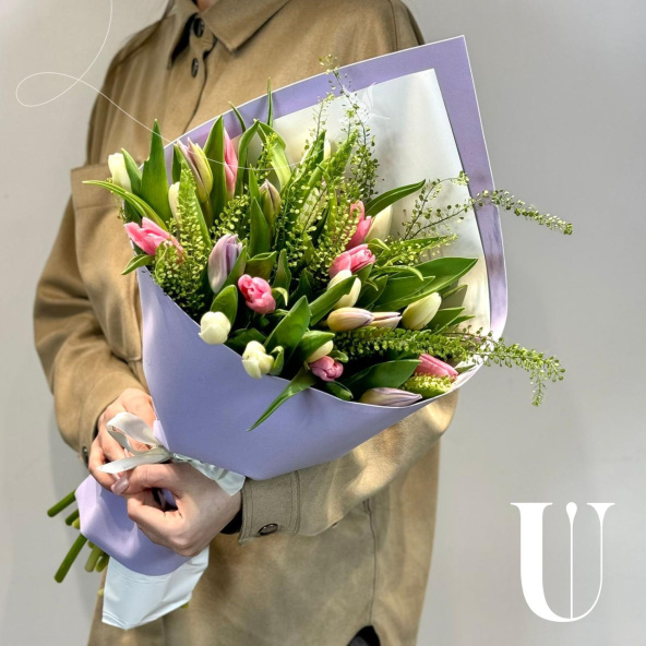 Монобукет из розовых кустовых пионовидных роз в матовой упаковке