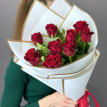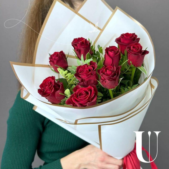 Монобукет из 9 красных роз в белой упаковке