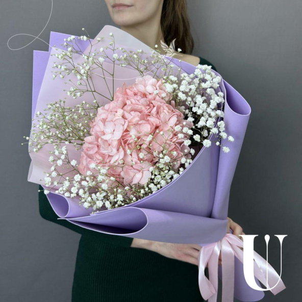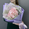 Монобукет из белых роз и роз сорта Леди Раффаэла в сиреневой упаковке
