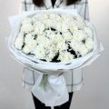 Монобукет из белых роз и роз сорта Леди Раффаэла в сиреневой упаковке