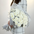 Монобукет из белых роз и роз сорта Леди Раффаэла в сиреневой упаковке