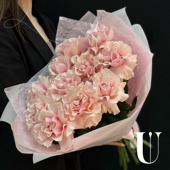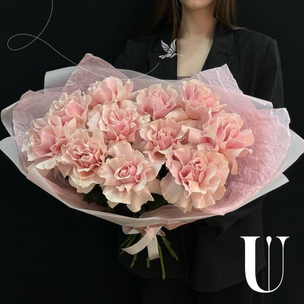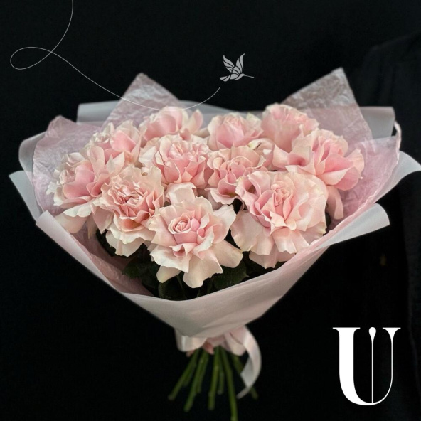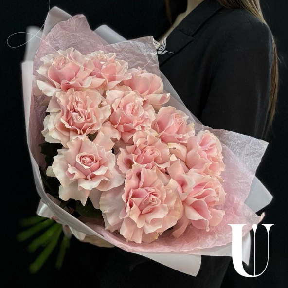 Монобукет из 11 розовых роз в светло-розовой упаковке