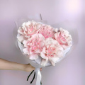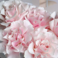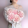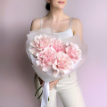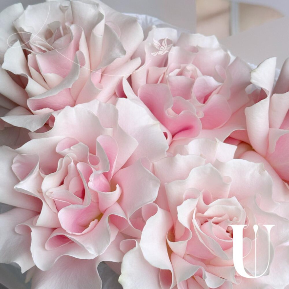 Монобукет из белых роз и роз сорта Леди Раффаэла в сиреневой упаковке