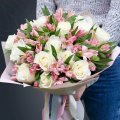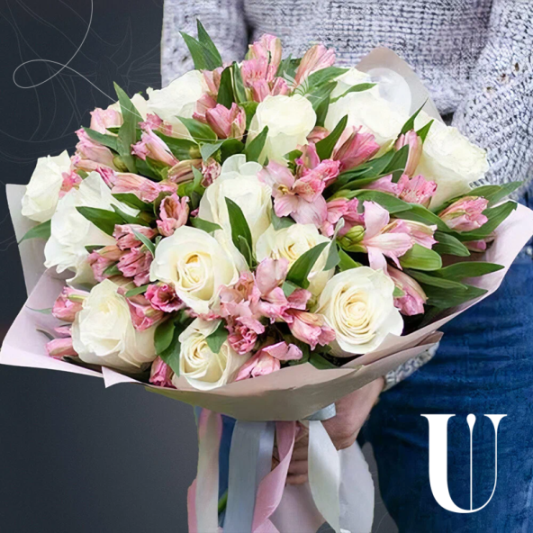 Букет включает в себя 29 цветов - 19 белых Эквадорских роз и 10 розовых альстромерий. Белые Эквадорские розы - это высококачественные цветы, которые известны своими насыщенными оттенками и приятным ароматом, который долго будет радовать вас и ваших близких. Альстромерии в составе букета известны своей стойкостью и долгим сроком жизни, а также визуальной легкостью, свежестью и нежностью.