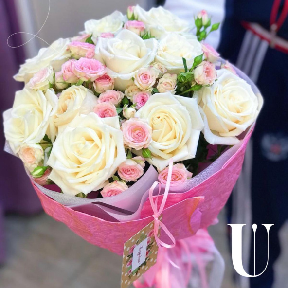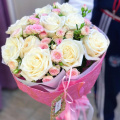 Воздушная композиция из белых роз в дизайнерской упаковке