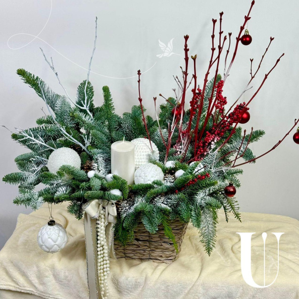 Композиция из нобилиса, свечей и новогоднего декора в коробке