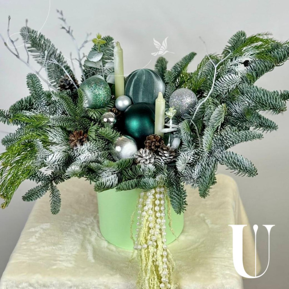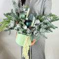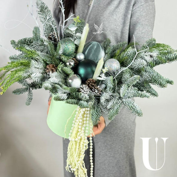 Новогодняя композиция из нобилиса, гортензии и новогоднего декора в шляпной коробке