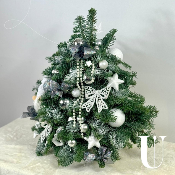 Композиция из елочки украшенной новогодним декором