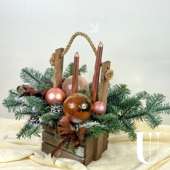 Композиция из нобилиса, свечей и игрушек в коробке